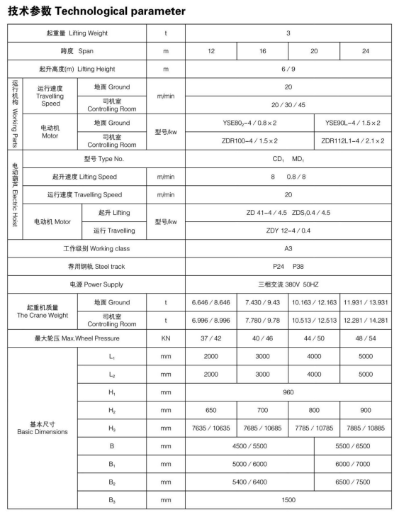 MH型3t單梁門式起重機(jī)是中小型可帶懸臂的簡易3t門式起重機(jī),3t電動(dòng)葫蘆采用CDI、MDI等形式,主梁是U型槽板與工字鋼焊接而成的組合梁,大車運(yùn)行機(jī)構(gòu)采用三合一驅(qū)動(dòng)裝置。其適用起重量為3t,適用跨度為7.5-30米,工作環(huán)境溫度在-25—+40℃范圍內(nèi)。其結(jié)構(gòu)簡單、安裝、使用、維修方便,多用于工廠、貨場、碼頭、水電站等使用頻度低或額定起重量起吊次數(shù)少的場所。