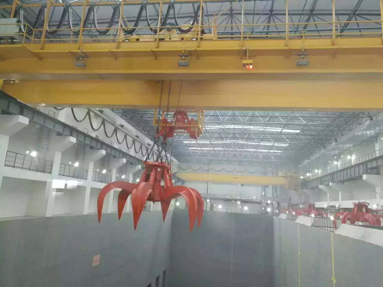 兩用橋式起重機(jī)有三種:抓鉤橋式起重機(jī)、電磁鉤橋式起重機(jī)和抓鉤電磁橋式起重機(jī)。其特征是一個(gè)小車上有兩個(gè)獨(dú)立的升降機(jī)構(gòu),一個(gè)用于抓斗,一個(gè)用于吊鉤(或一個(gè)用于電磁吸盤,一個(gè)用于吊鉤,或一個(gè)用于抓斗,一個(gè)用于電磁吸盤),但兩個(gè)升降機(jī)構(gòu)不能同時(shí)使用。